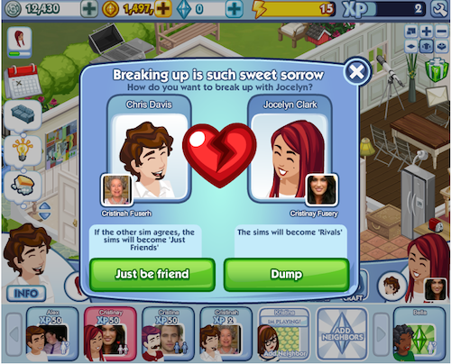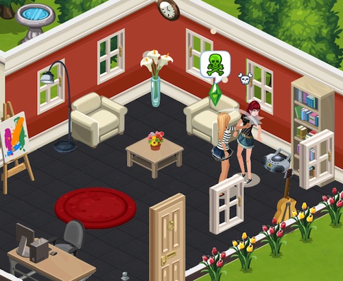 In the Sims Social, most of the gameplay common to all three core Sims games in the PC franchise can be found — such as clicking on toilets to prevent the Sim from wetting him or herself, completing a set of interactions to fulfill what amounts to a quest, and interacting with other Sims to make friends or enemies. What makes The Sims Social unique to the Sims series are the addition of traditional Facebook game elements like an energy gauge that depletes by action and replenishes over time, a farming element where the Sims can grow produce in their garden, or multiplayer where friends can visit each other’s Sims and see what their houses look like. Also, players earn virtual currency for certain interactions like improving a skill or interacting with another Sim.