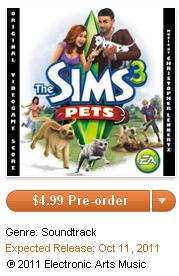 By now you should be aware that Amazon has already listed the soundtrack for Pets. Today, it was also added to iTunes. You can’t buy it or sample the songs yet, but it’s there. Thanks to iTunes we now know the price of the album, $4.99 is what it will cost. That’s pretty good for 14 songs. That’s 35 cents a song. So on October 11th, pick up The Sims 3: Pets soundtrack for $4.99 US and enjoy.