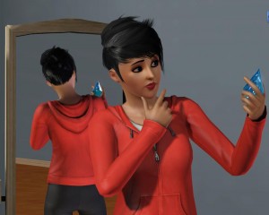 The very cool Alexis of SimsVIP shared a pic last night on FB. It was a female Sim looking at a blue plumbob shared gem in CAS. I obviously LIKED the pic and then commented. Here’s both her pic and my comment. Enjoy!